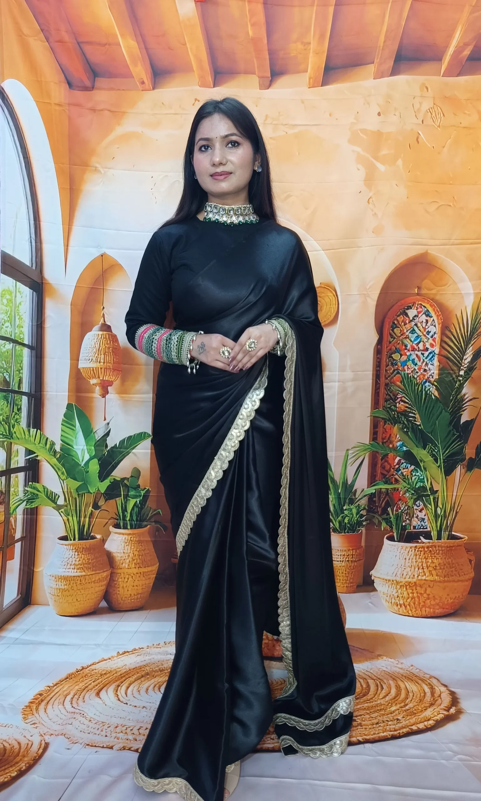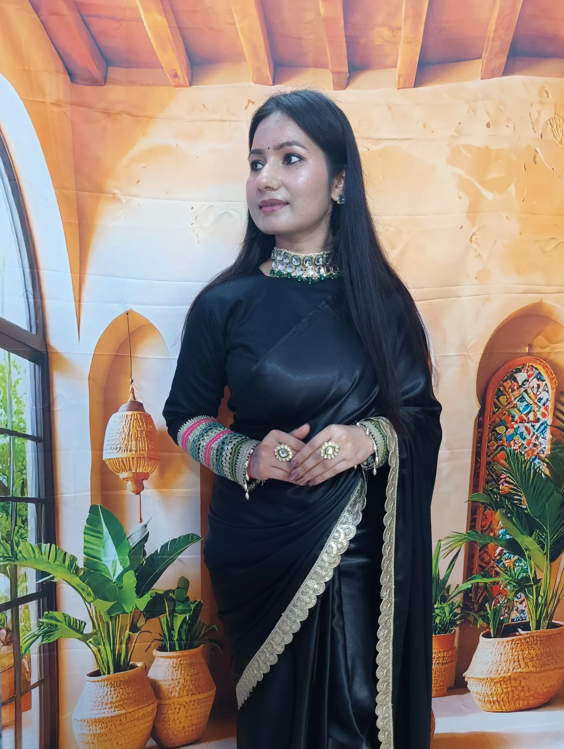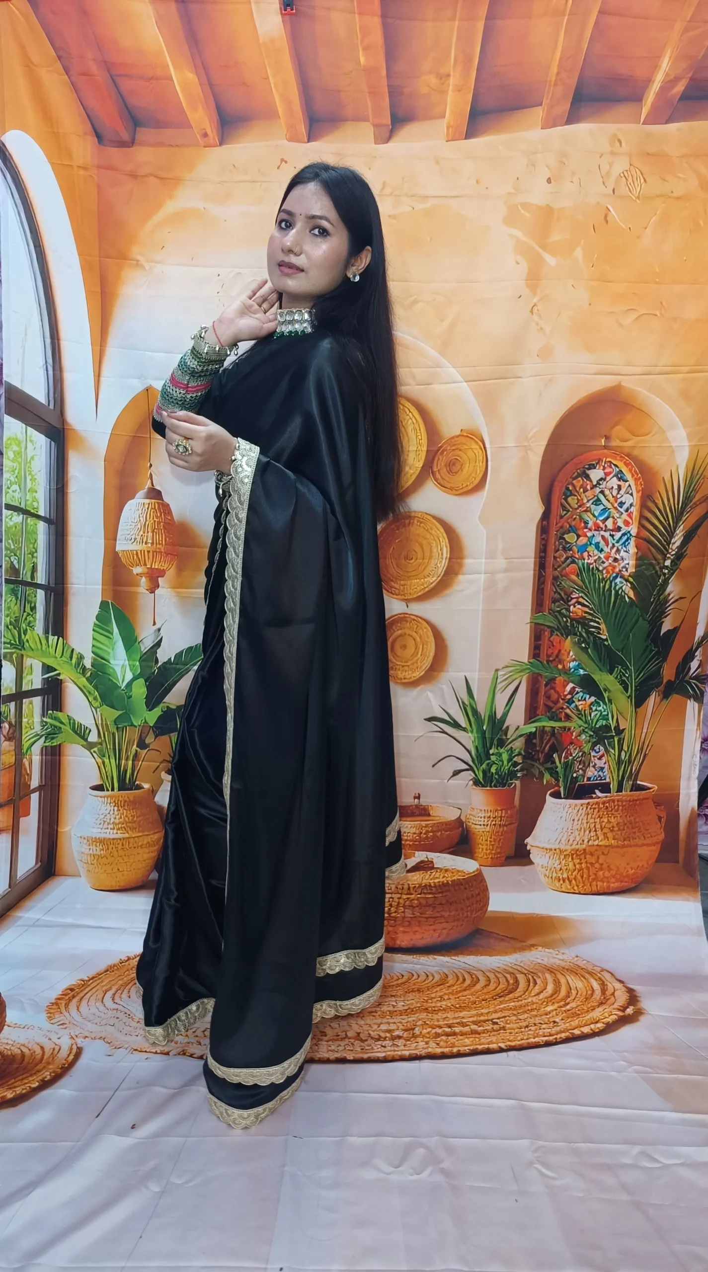 Add timeless elegance to your wardrobe with this stunning black satin saree, designed to make a bold yet graceful statement. Crafted from smooth and lustrous satin fabric, this saree drapes beautifully, enhancing your silhouette with a rich, flowy fall.