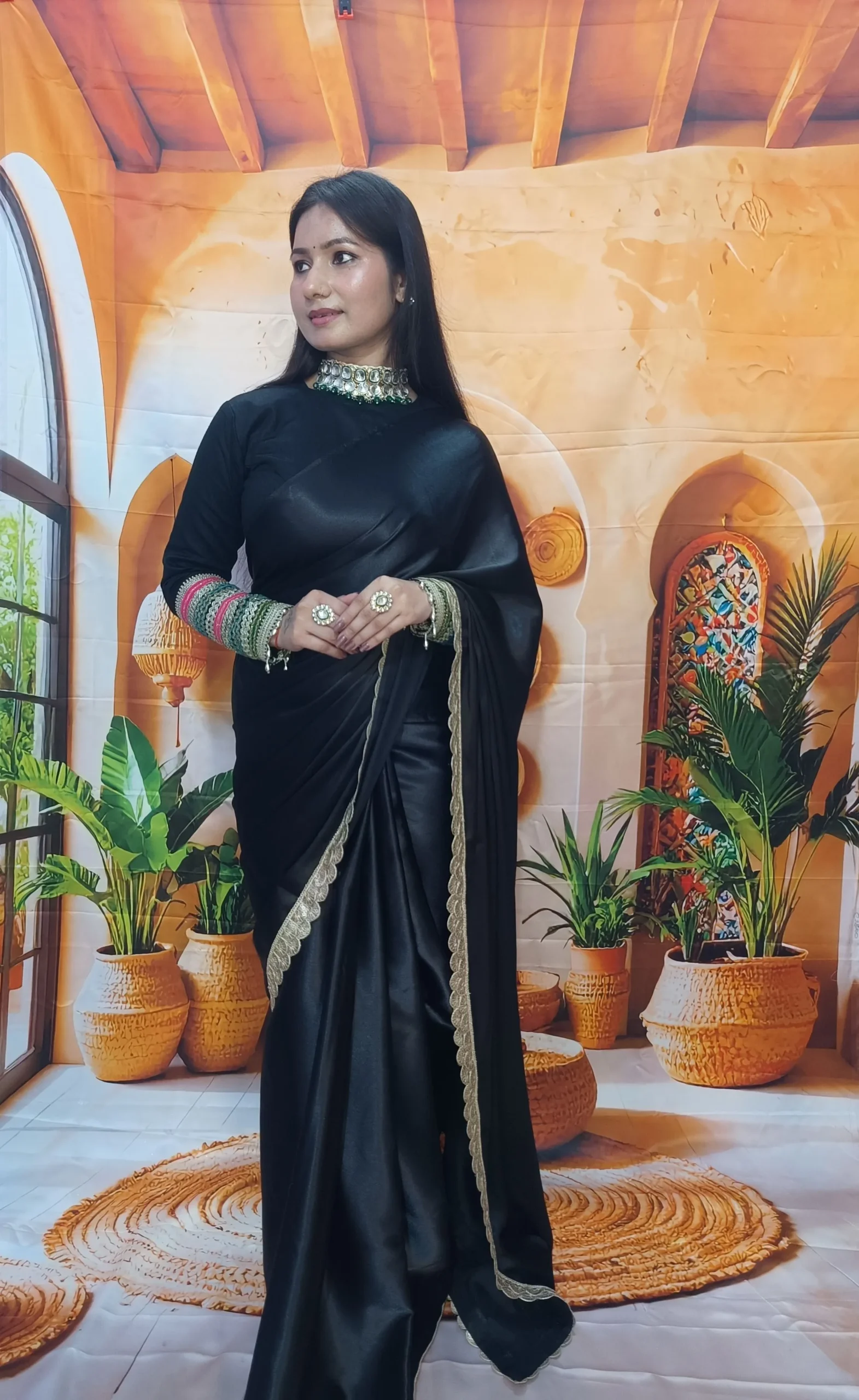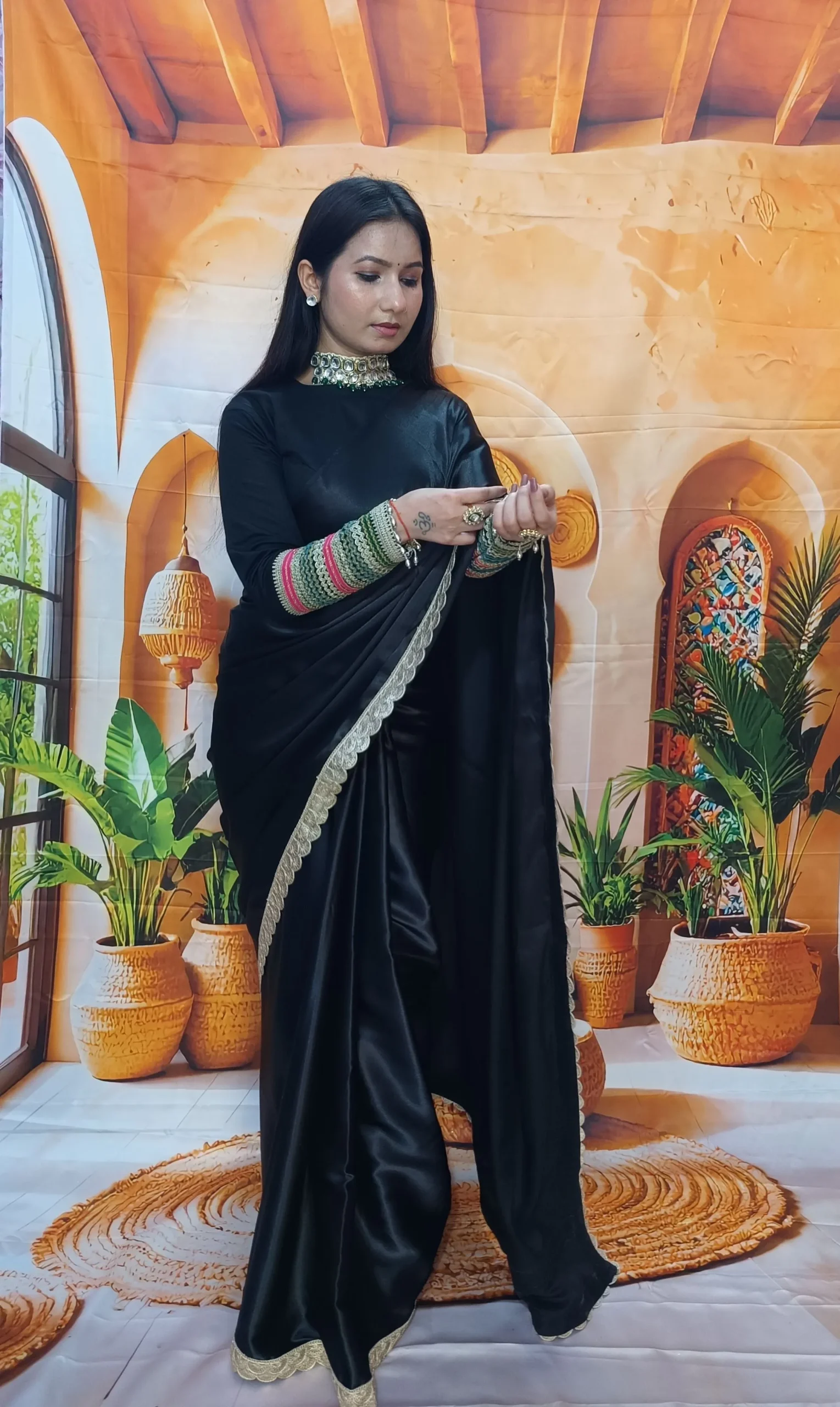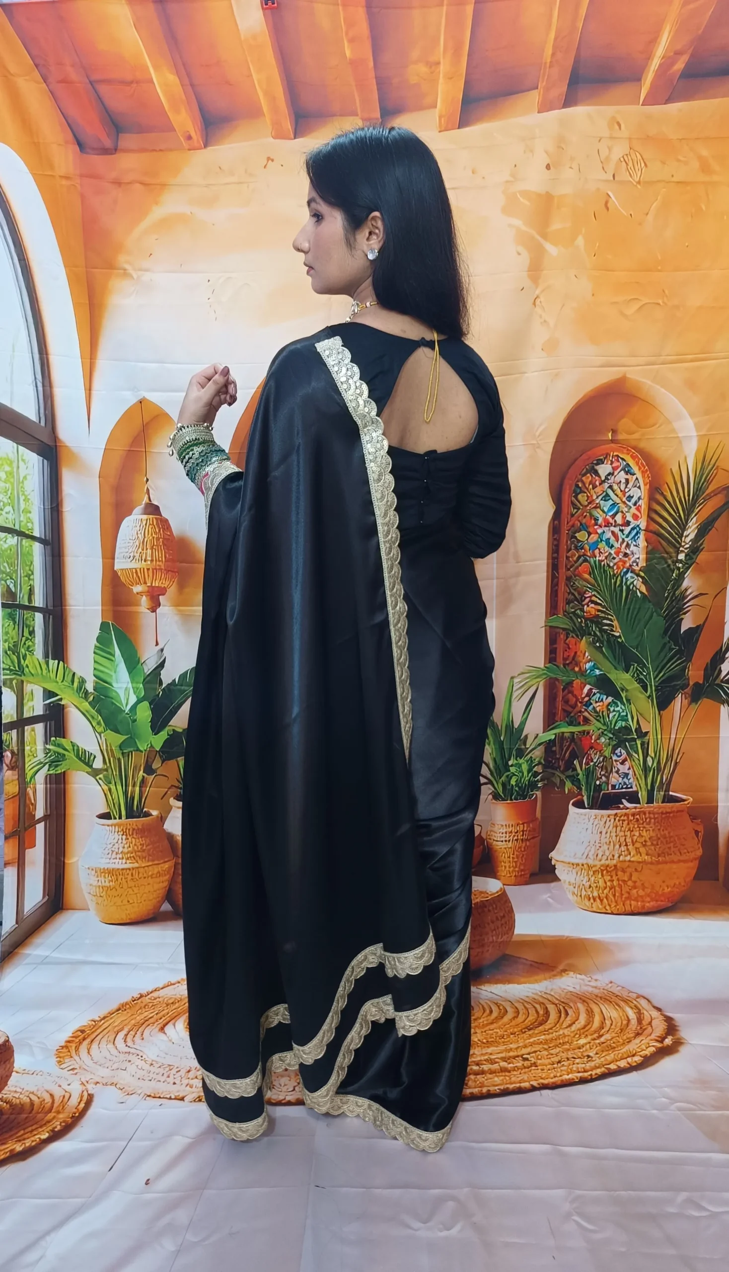 Add timeless elegance to your wardrobe with this stunning black satin saree, designed to make a bold yet graceful statement. Crafted from smooth and lustrous satin fabric, this saree drapes beautifully, enhancing your silhouette with a rich, flowy fall.