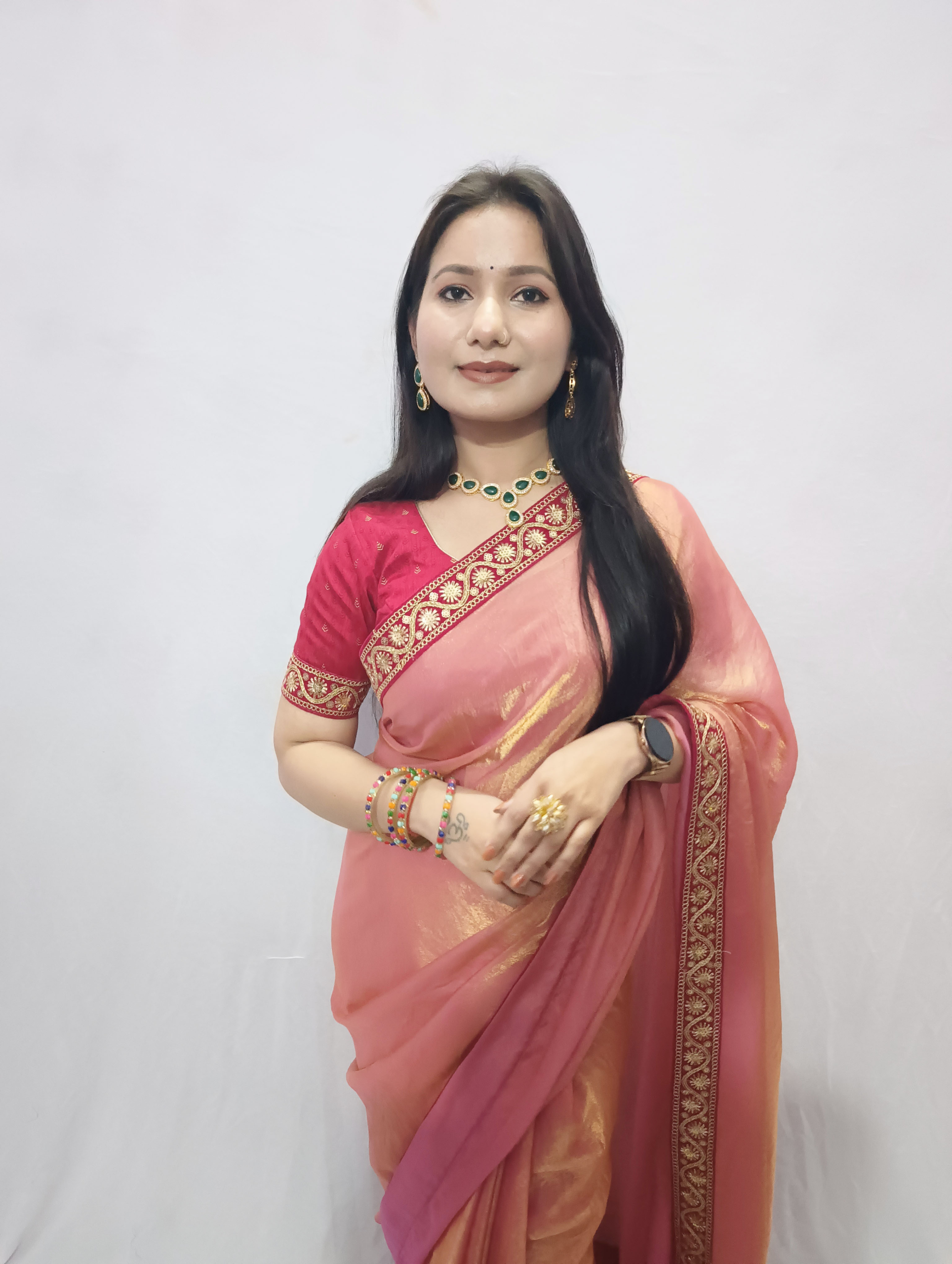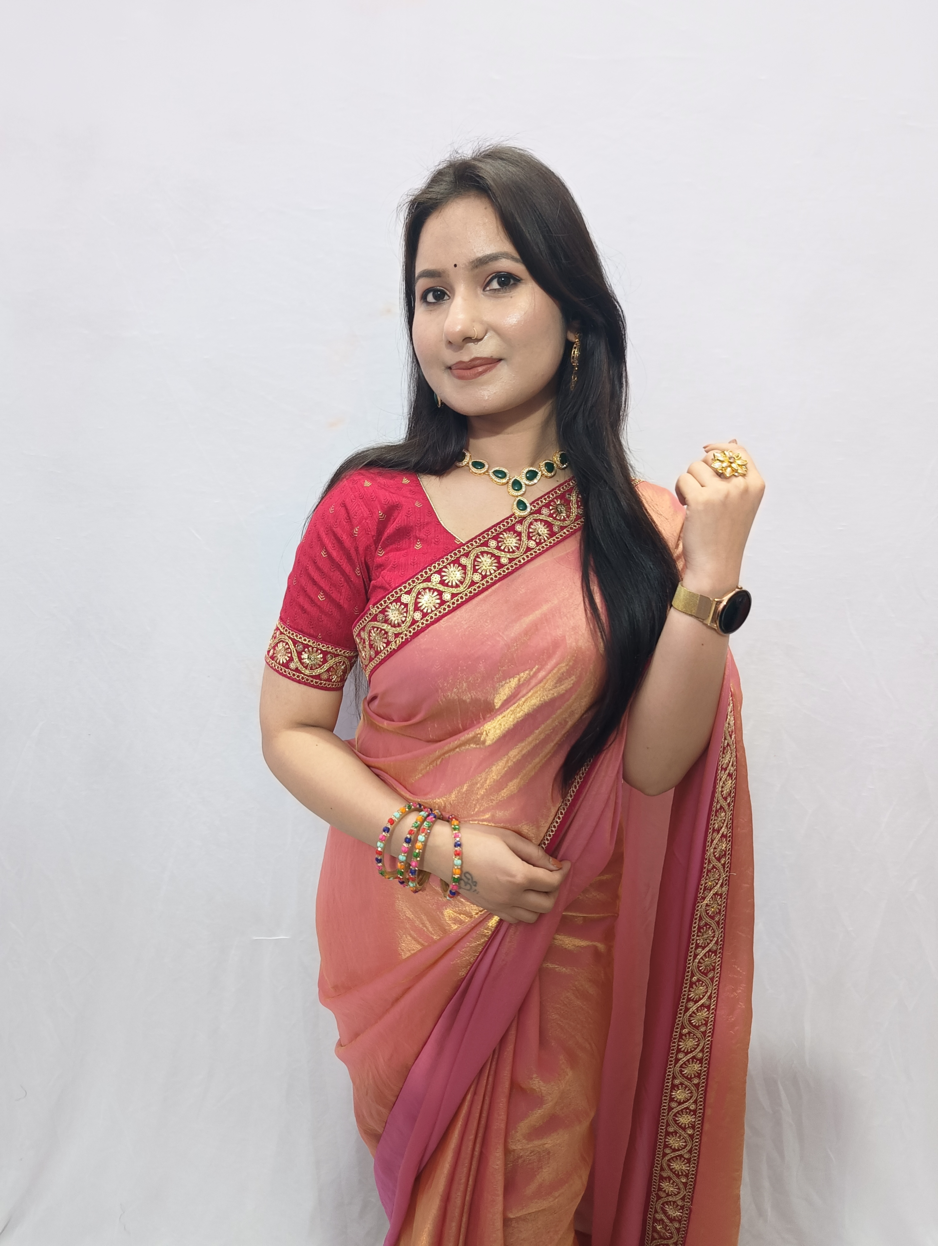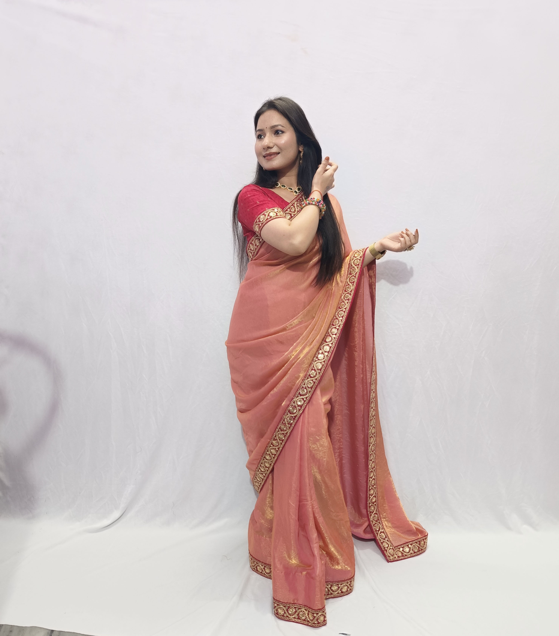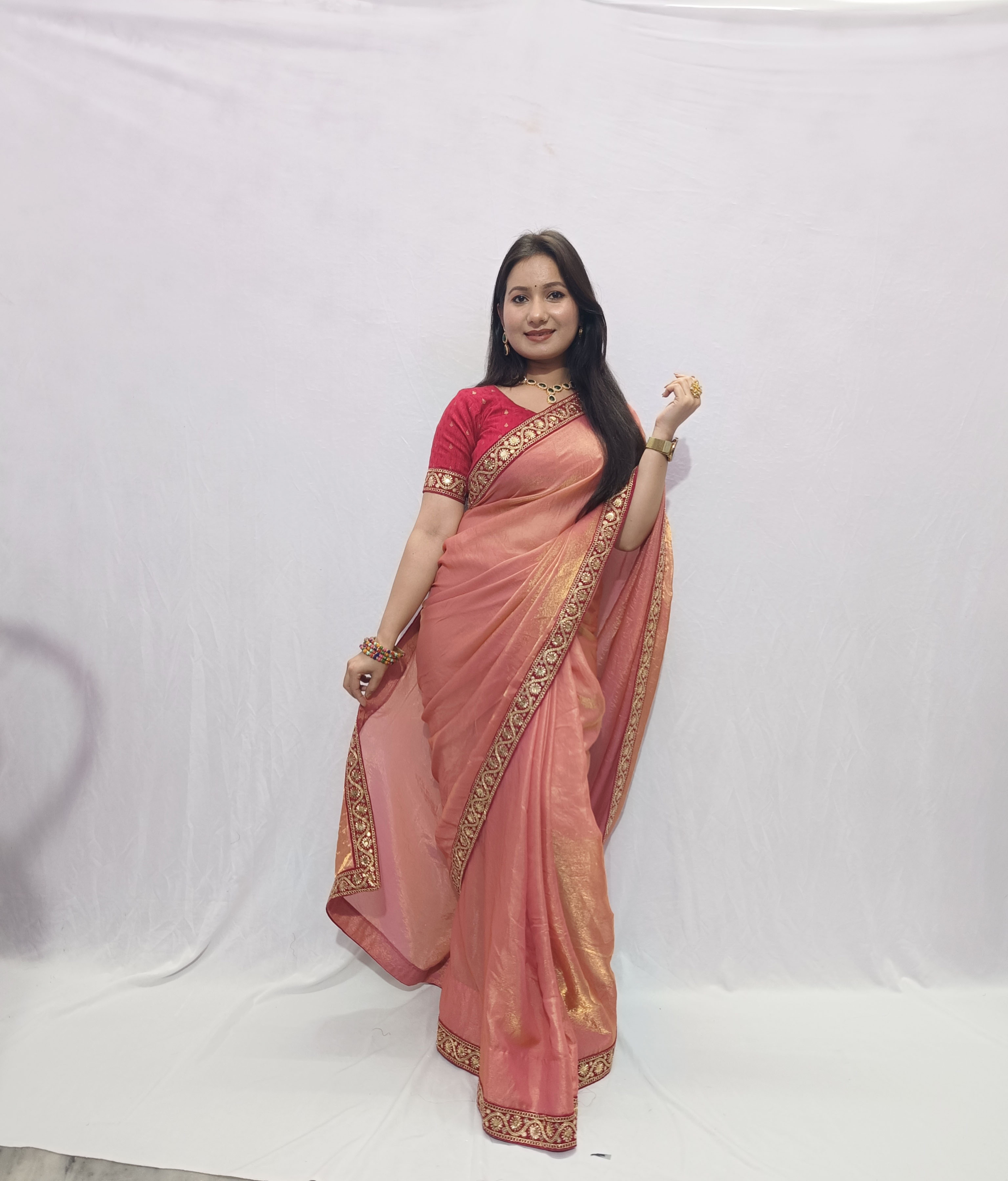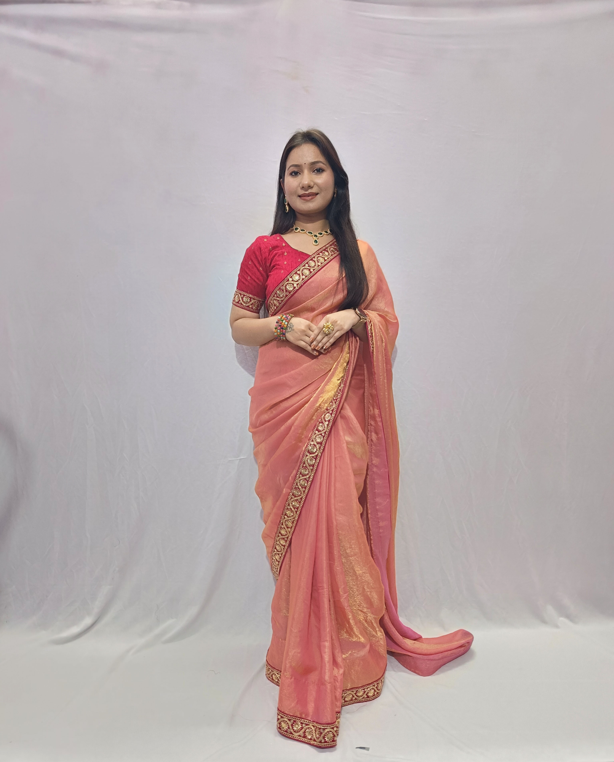 This saree features a graceful peach-colored saree crafted from a lightweight, Trendy fendy silk fabric that drapes beautifully. The saree is enhanced with an hot pink-gold embroidered border, adding a touch of traditional richness and elegance. It is paired with a matching hot pink blouse featuring coordinated gold detailing along the whole fabric of the blouse, creating a striking contrast.