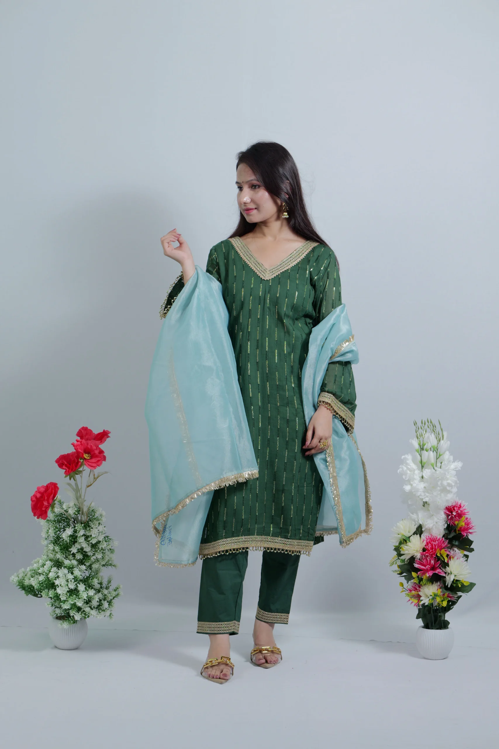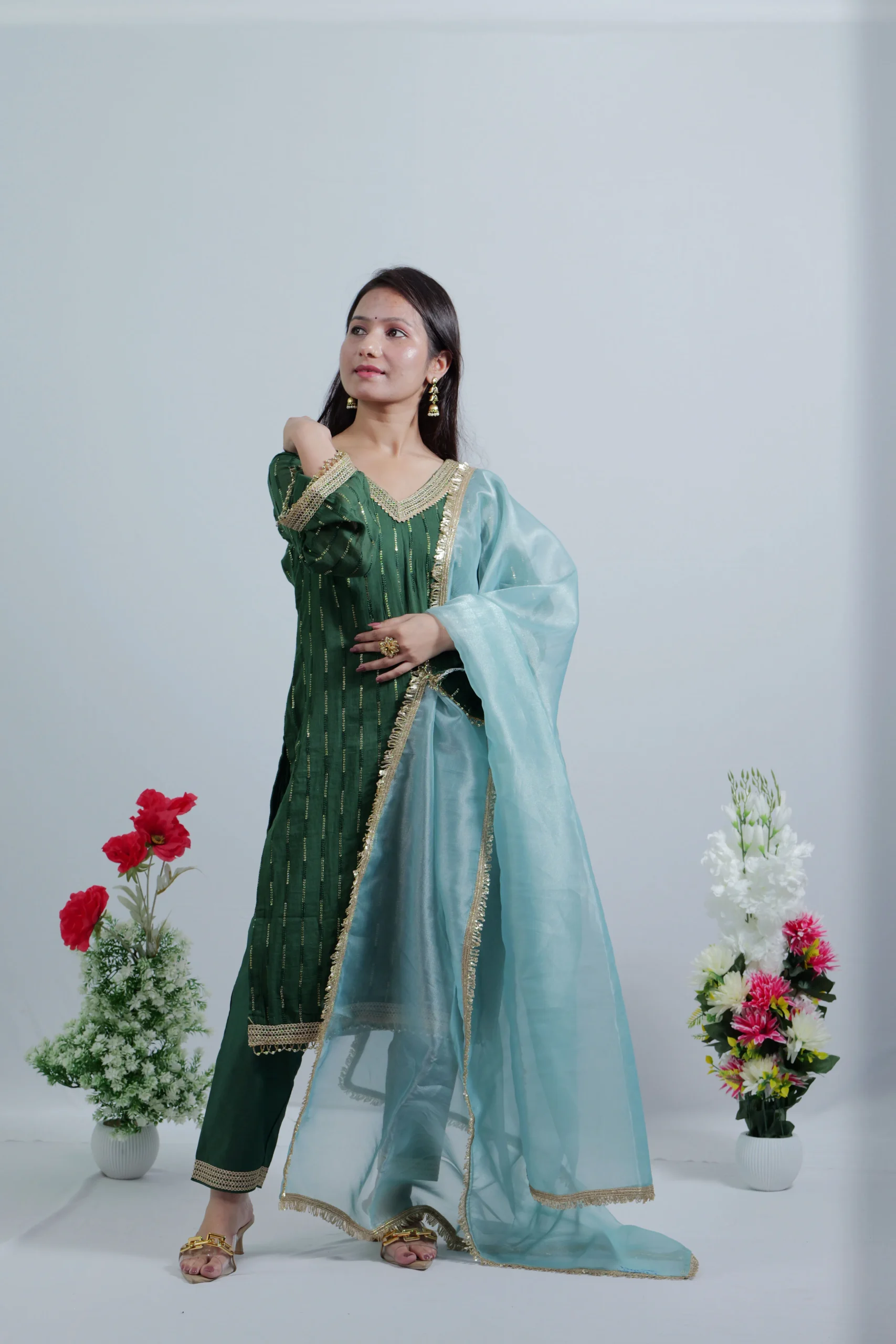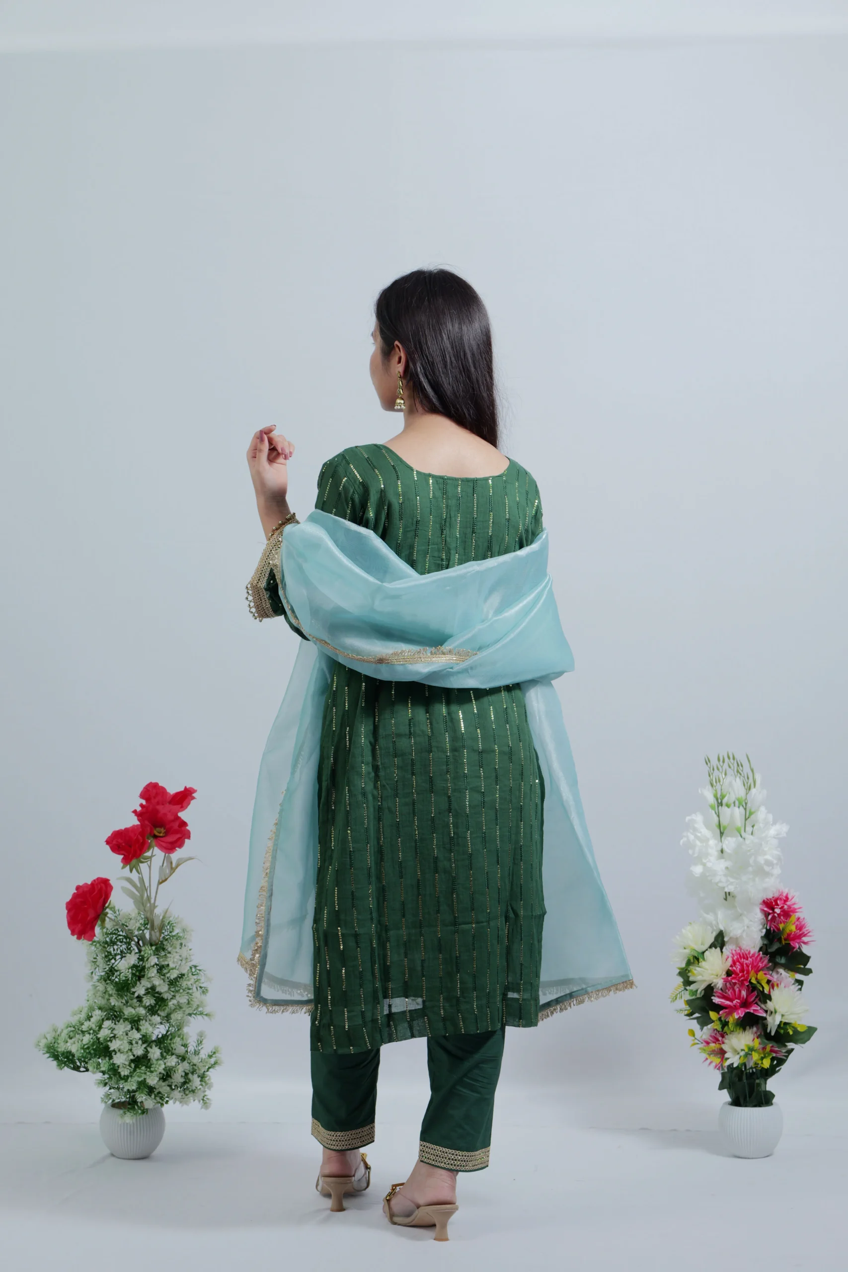 Dark green cotton fabric with sequins embellishment kurta paired with cotton matching cambric pant with contrast organza dupatta. Best outfit for a small party and festive season.