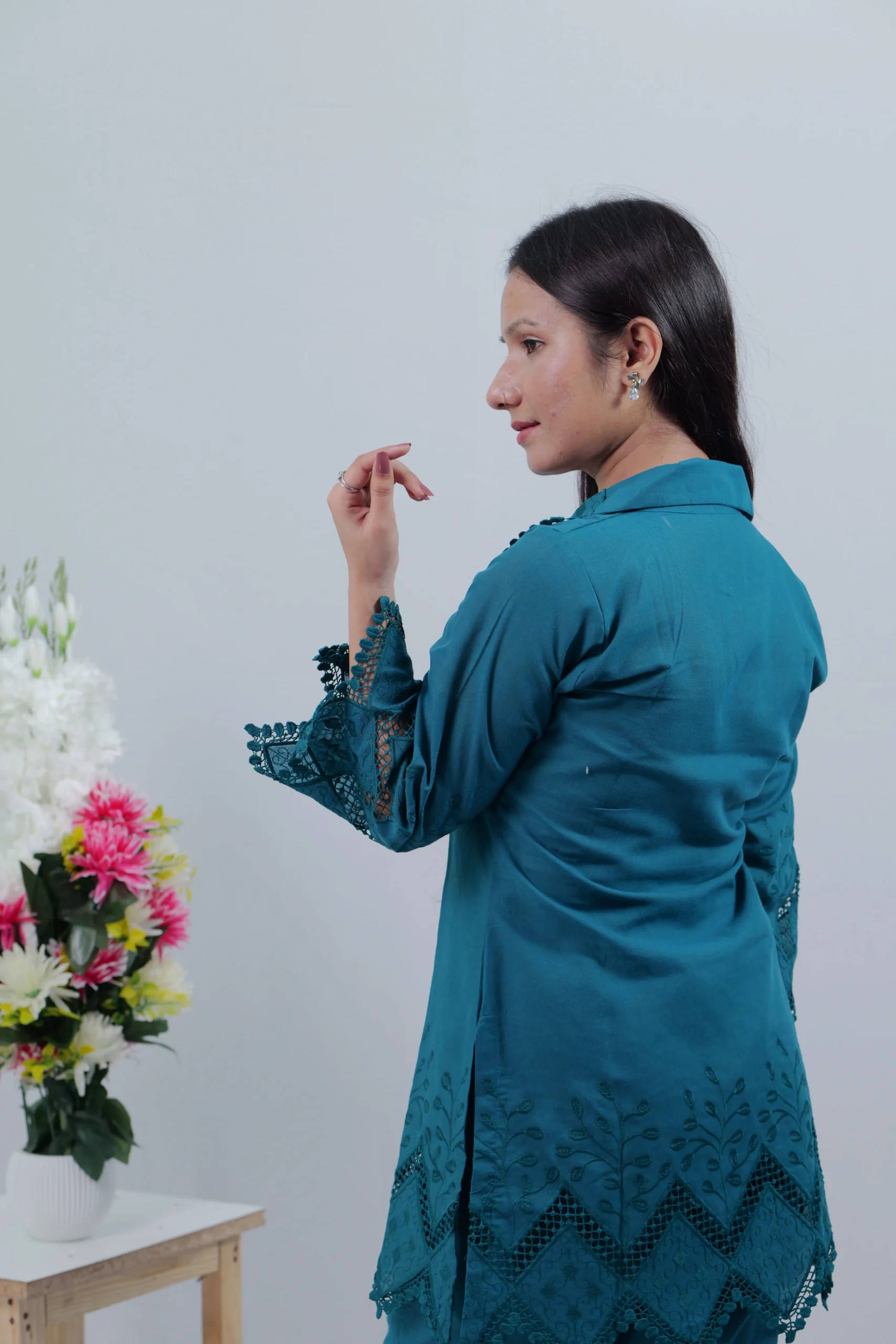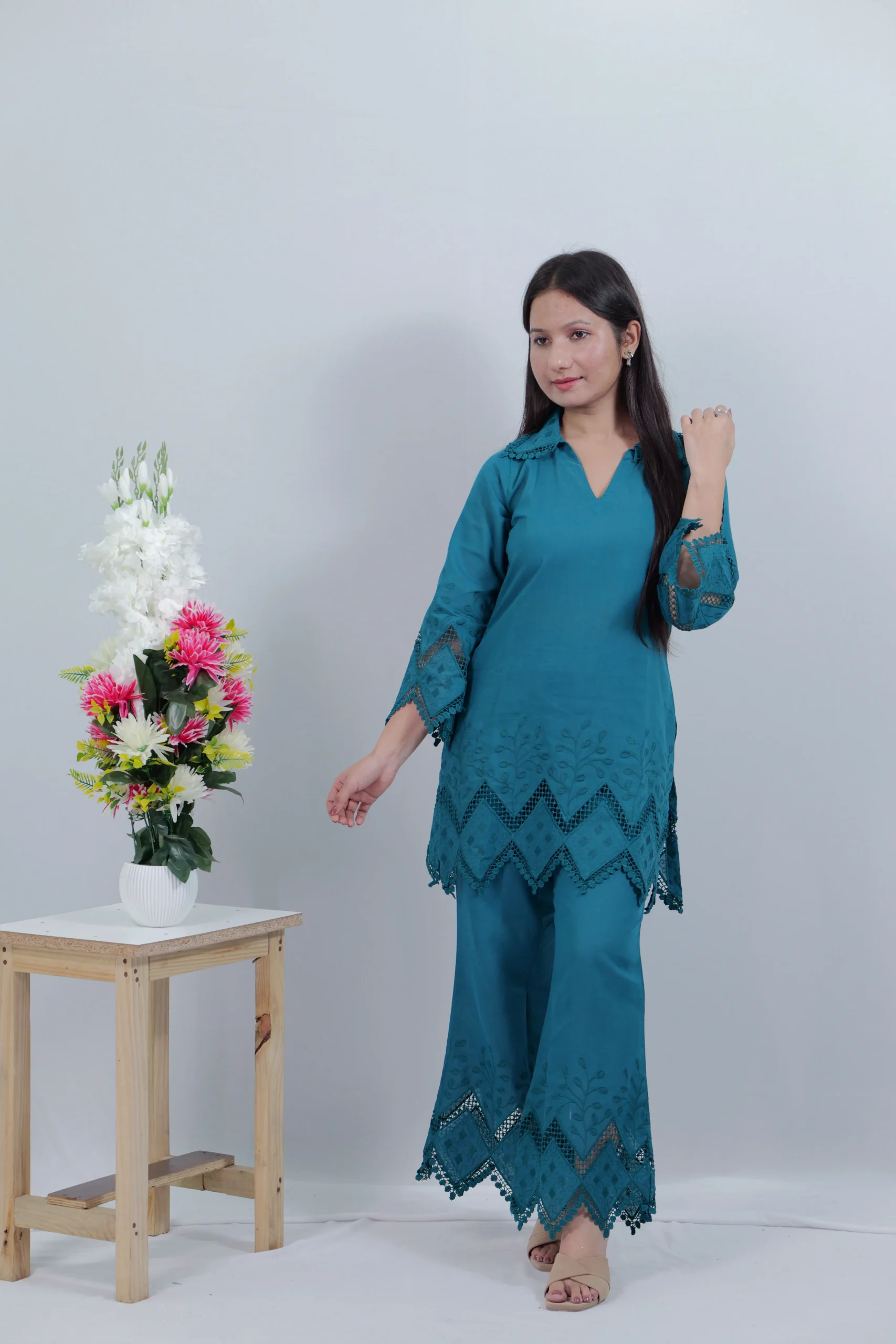 The vibrant peacock blue blended cotton co-ord set features beautiful matching lace, paired with a matching straight pant. This outfit is perfect for the outings and casual parties.