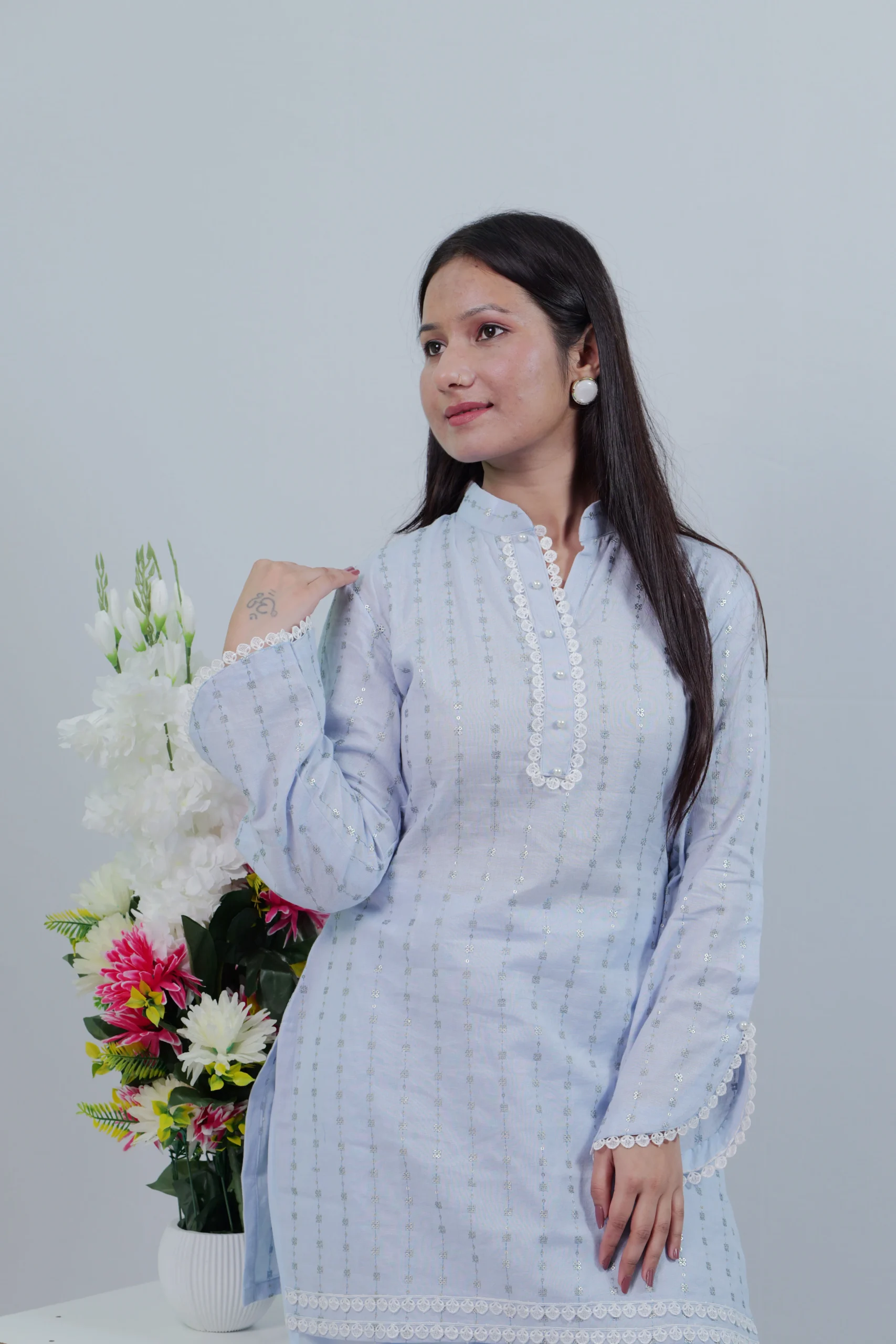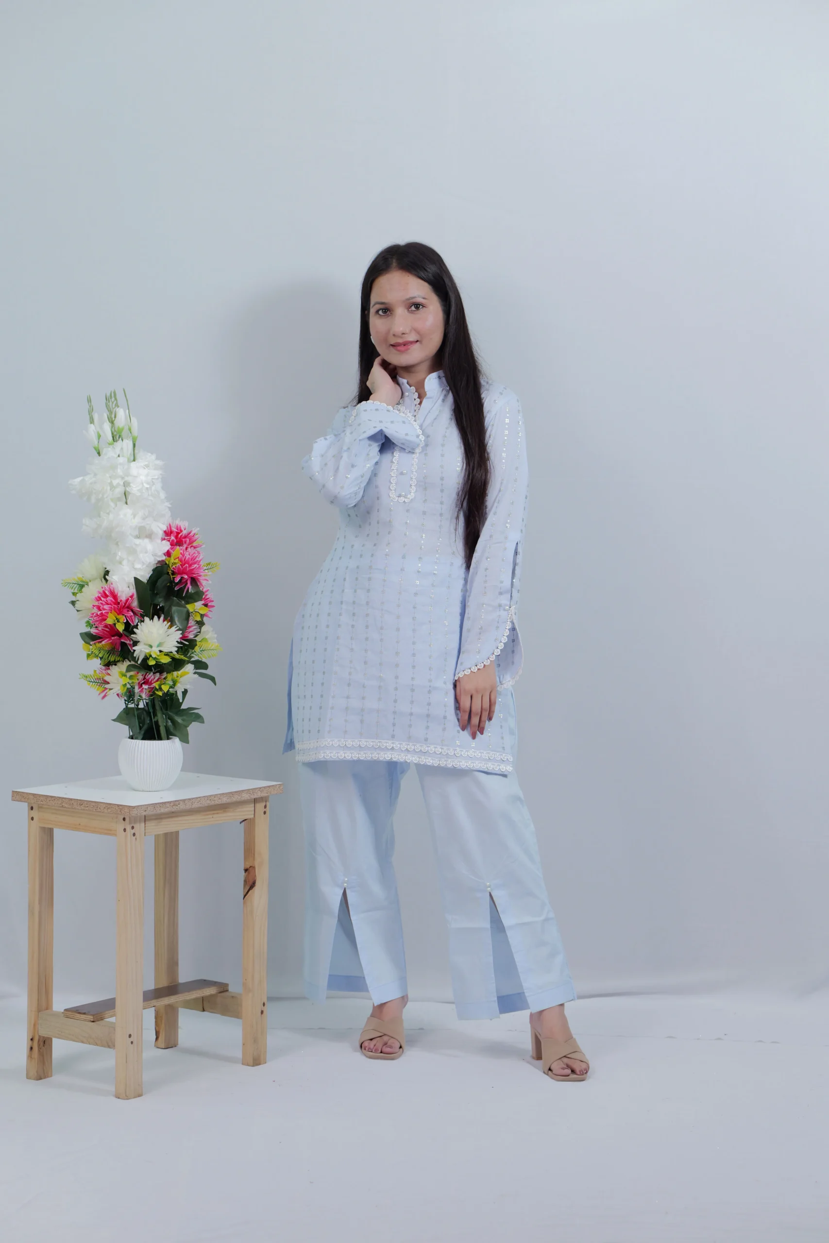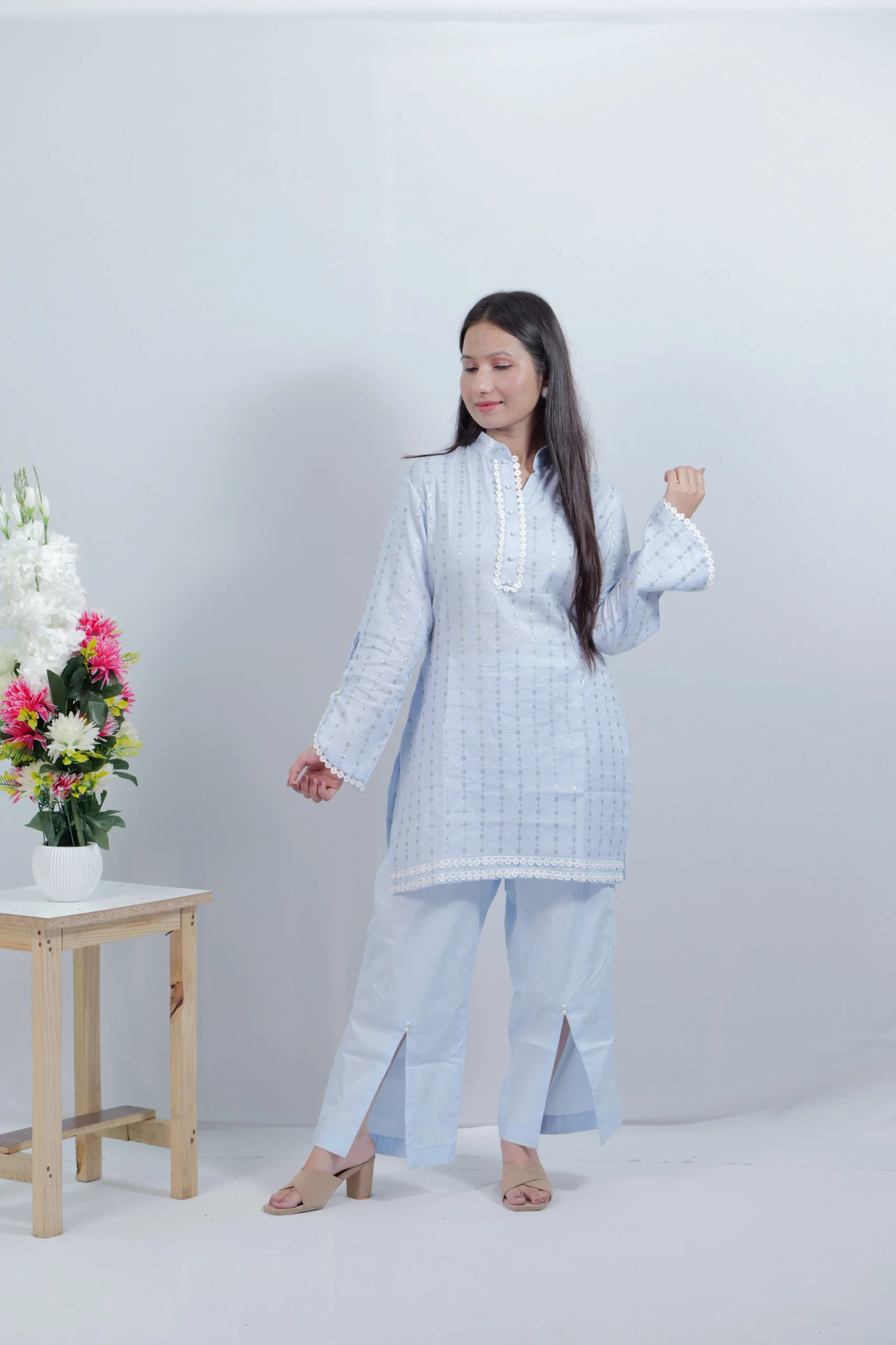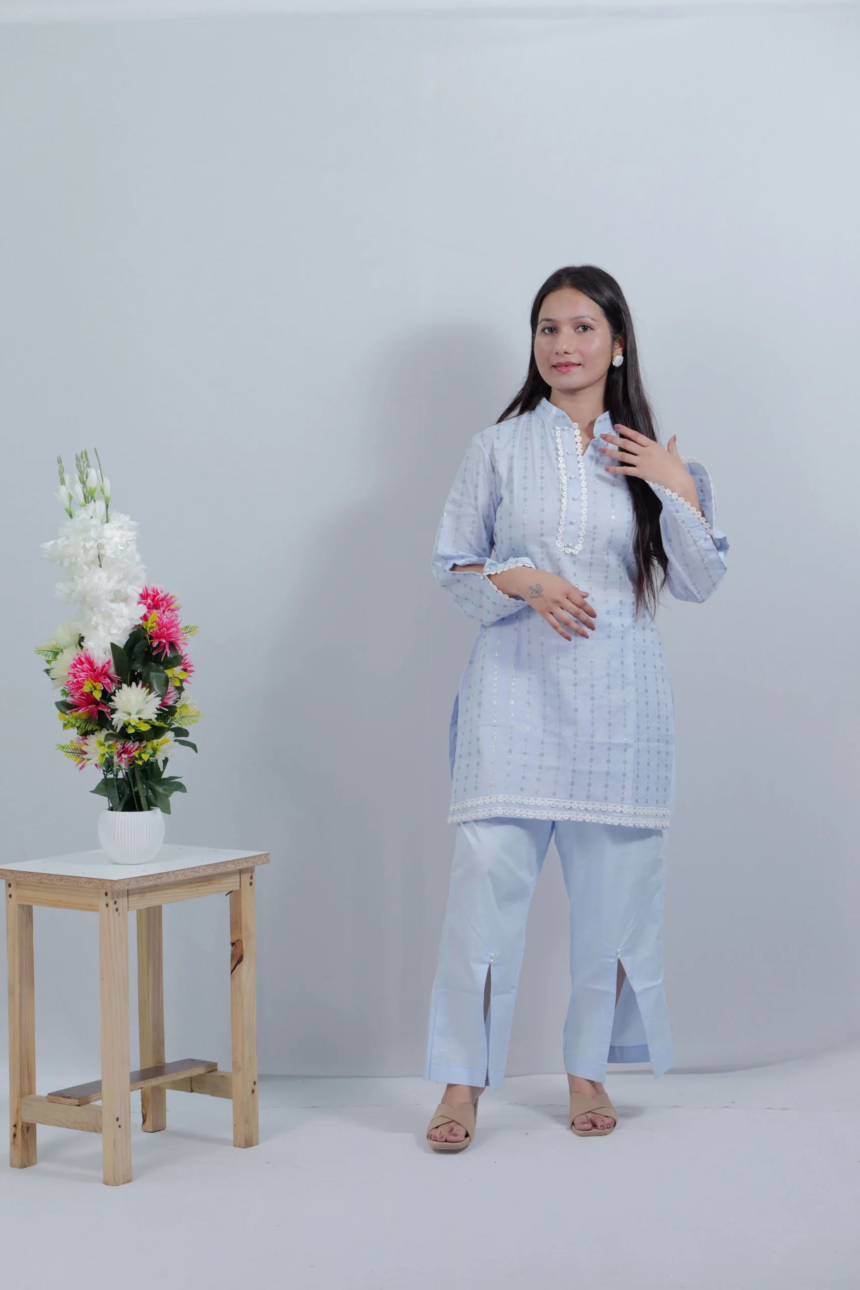 Brighten up your wardrobe with this yellow Co-ord set, featuring fine white thread embroidery on cotton fabric, with a beautiful collar neckline and beautifully placed white cotton lace over it. With its blend of comfort and style, this set is perfect for brunch dates, casual celebrations, or relaxed festive dressing.