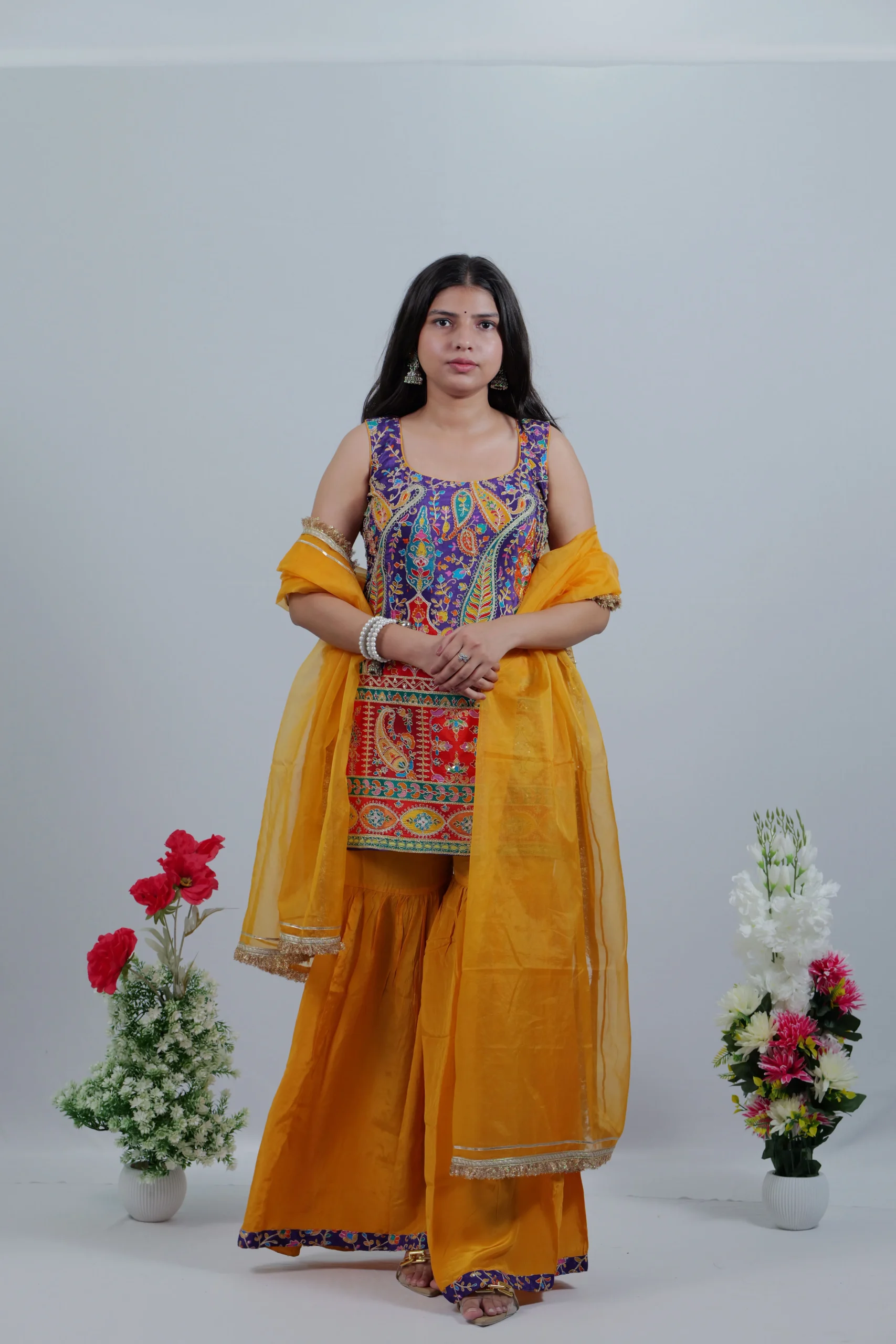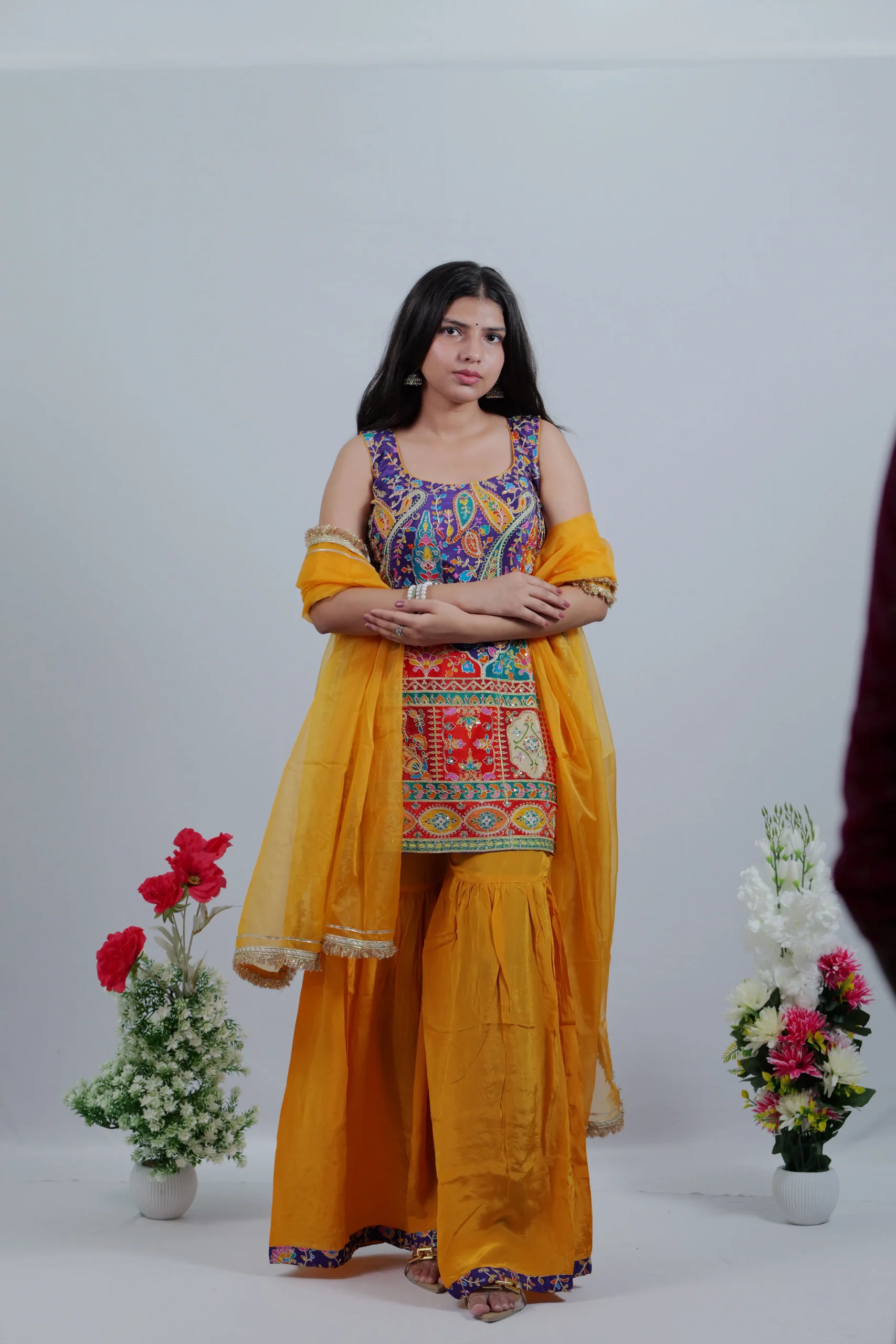 Purple Poly crepe fabric with beautiful fine thread embroidery on kurta, and having plain yellow poly crepe sharara with organza yellow dupatta with fringe lace border. This color match is perfect for festive season.