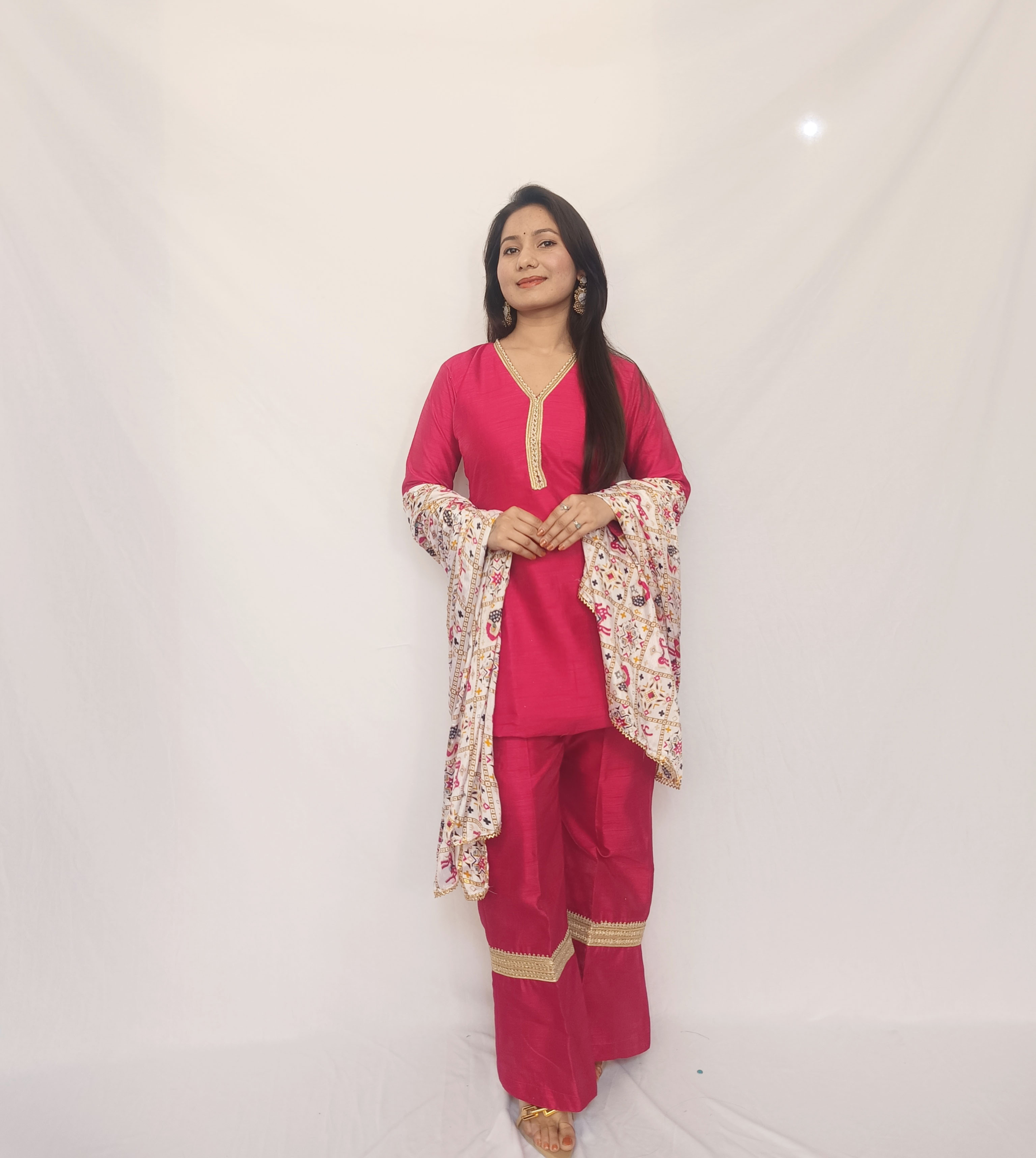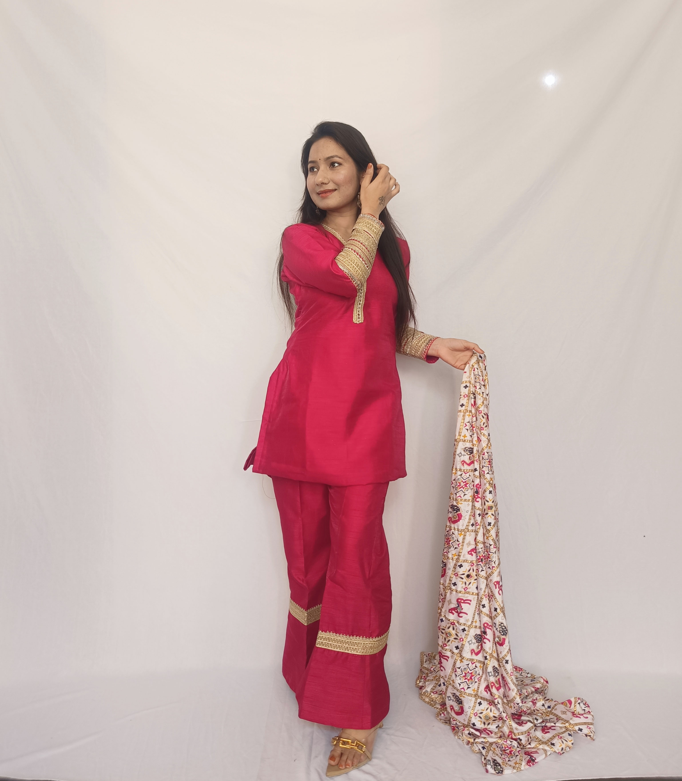 This outfit features a striking pink kurta set designed to make a bold yet elegant statement. The kurta is tailored in a straight silhouette with a flattering V-neckline, highlighted by delicate golden lace detailing along the neckline and sleeve cuffs. It is paired with matching wide-leg pants adorned with coordinated gold accents near the hem, adding a touch of festive charm. The ensemble is beautifully complemented by a soft, flowy dupatta featuring intricate multicolored prints, creating a perfect balance of vibrancy and tradition. Ideal for festive occasions, celebrations, or special gatherings, this outfit blends modern style with ethnic elegance.