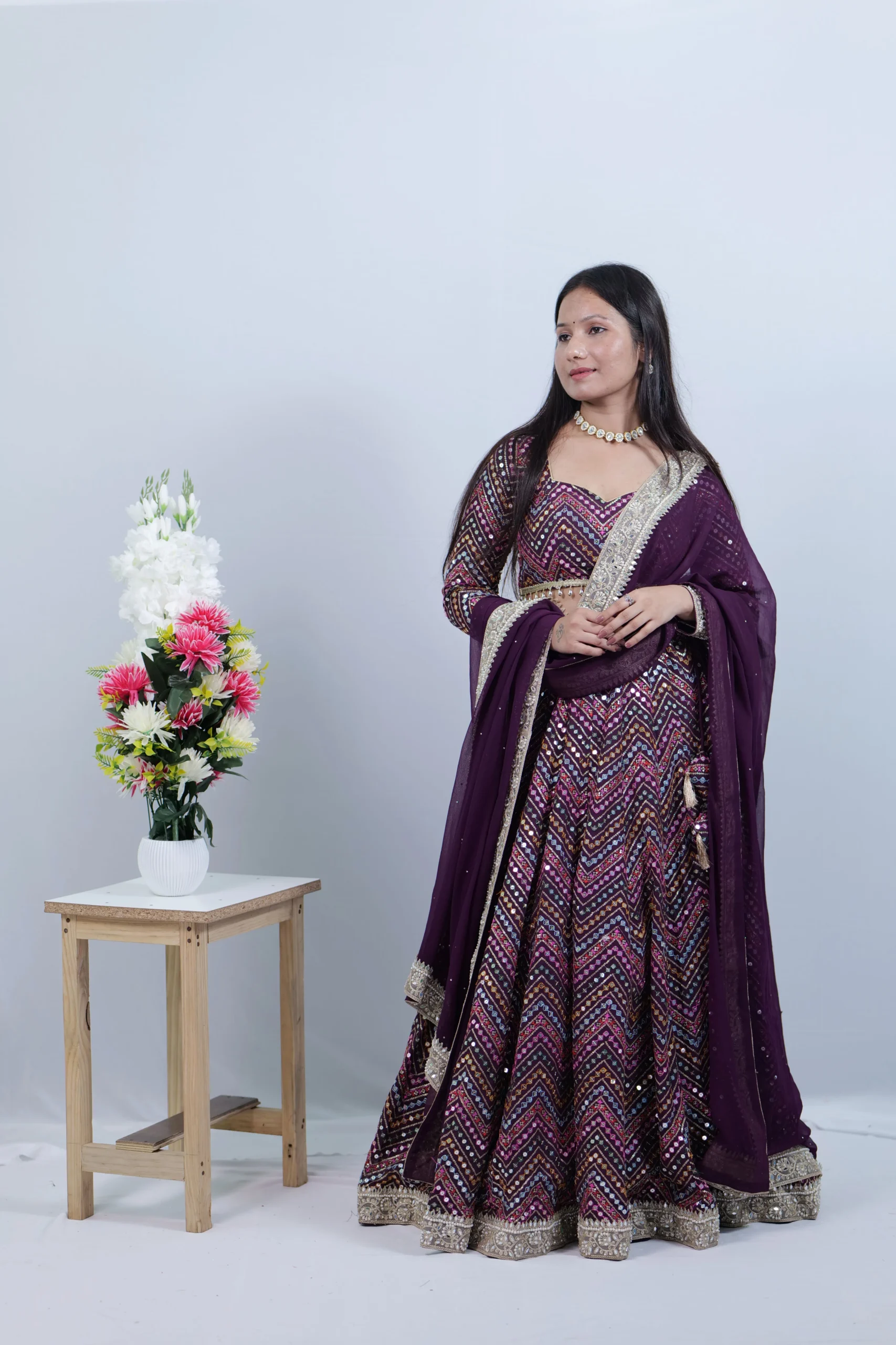 Wine beautiful georgette lehenga featuring fine thread and sequence beautiful embroidery, paired with a matching blouse and a beautiful dupatta with heavy border. Perfect outfit for wedding or fastive season.